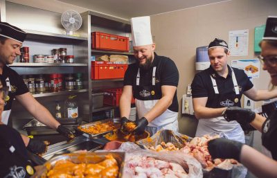 Um 9 Uhr startete das Vorhaben und die Kochgruppe der Bäckerei Der Mann schwingt den Kochlöffel für 250 Obdachlose. Gekocht wurde Hühnchen mit Kartoffel-Karotten-Gemüse und Schmortomaten. Als Dessert wurde der beliebte Guglhupf „Sisi´s Süsser“ spendiert.