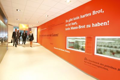 Anschliessend führt Sie ein verglaster Gang auf die Galerie mit Blick herunter in die Backstube der Bäckerei DerMann. Auf diesem Weg wird Ihnen mittels Touchscreens, Lautsprechern und Informationen am Glas der Produktionsvorgang von der Mühle bis zum Brot erklärt. Währenddessen können Sie unseren Bäckern und Konditoren bei ihren täglichen Arbeitsschritten zusehen.