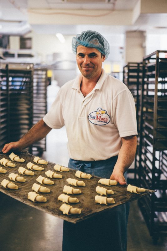 Anschliessend führt Sie ein verglaster Gang auf die Galerie mit Blick herunter in die Backstube der Bäckerei DerMann. Auf diesem Weg wird Ihnen mittels Touchscreens, Lautsprechern und Informationen am Glas der Produktionsvorgang von der Mühle bis zum Brot erklärt. Währenddessen können Sie unseren Bäckern und Konditoren bei ihren täglichen Arbeitsschritten zusehen.