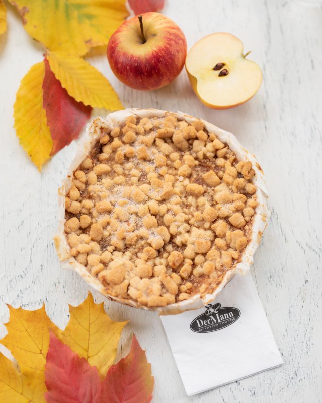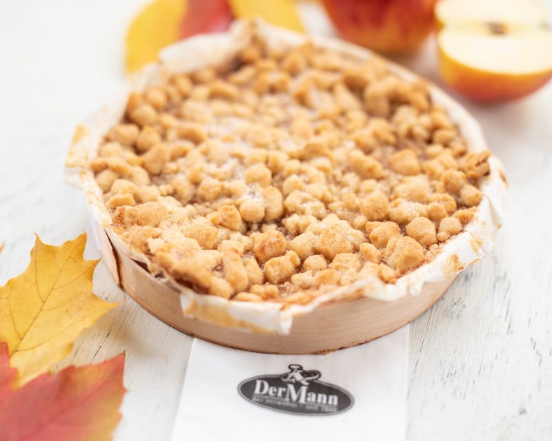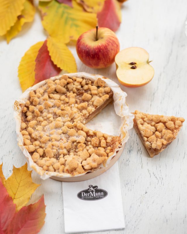 Aus Dinkelmürbteig mit frischen Apfelstückchen, bestreut mit Dinkelstreusel und Zimtzucker, entsteht in einem schonenden Backvorgang ein saftig-aromatischer Kuchen.