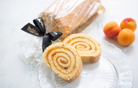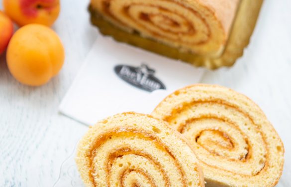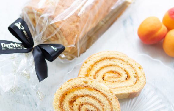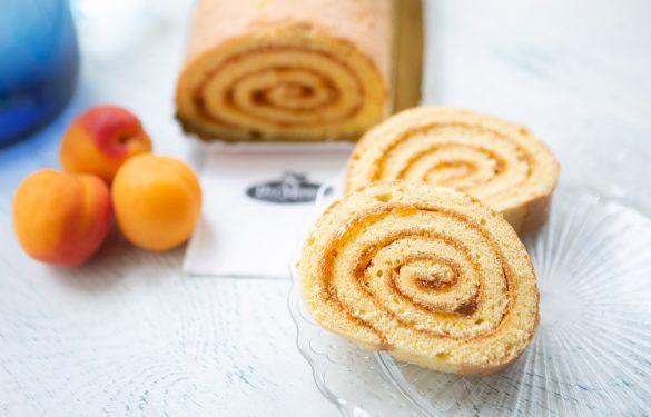 Das saftig-aromatische Biskuit wird nach dem Backen grosszügig mit Marillenmarmelade bestrichen und aufgerollt.