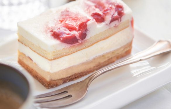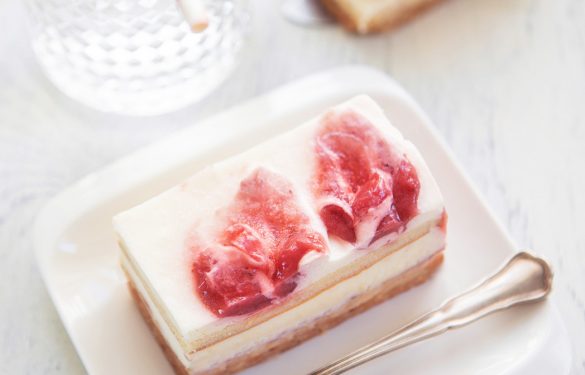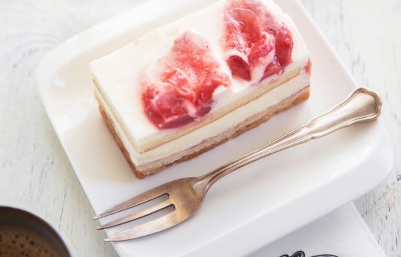 Die Schnitte hat einen knusprigen Streuselboden und 2 Schichten helles Bskuit, für die Füllung wird nur frische Buttermilch mit Schlagobers verwendet, obenauf hausgemachte Erdbeerfüllung.