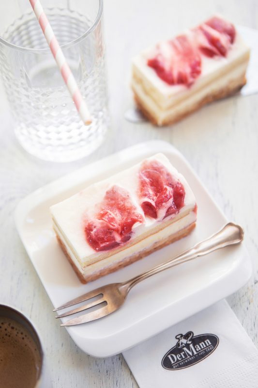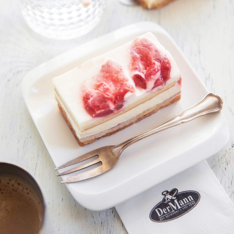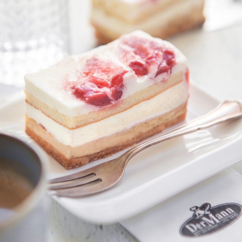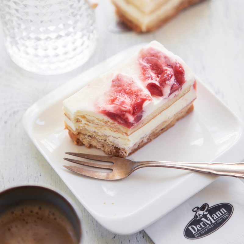 Die Schnitte hat einen knusprigen Streuselboden und 2 Schichten helles Bskuit, für die Füllung wird nur frische Buttermilch mit Schlagobers verwendet, obenauf hausgemachte Erdbeerfüllung.