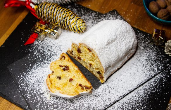 Bekannter, traditionsreicher Weihnachtsstollen, mit Rumrosinen und Früchten, in seiner speziellen Form.