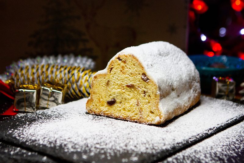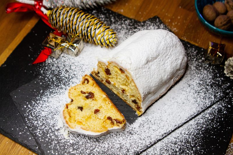 Bekannter, traditionsreicher Weihnachtsstollen, mit Rumrosinen und Früchten, in seiner speziellen Form.