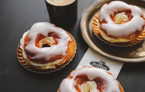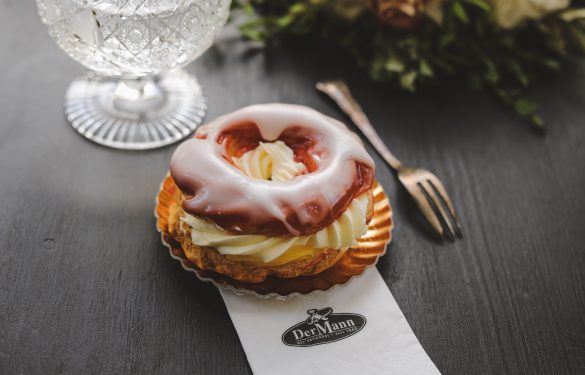 Ein luftig-leicht gebackener Ring aus Brandteig wird mit Puddingcreme und Schlagcreme gefüllt, auf der Oberseite mit Marillenmarmelade bestrichen und mit Fondant überzogen.
