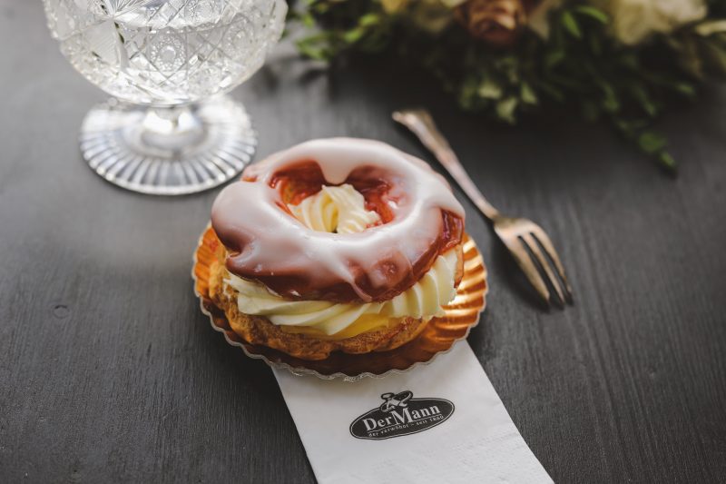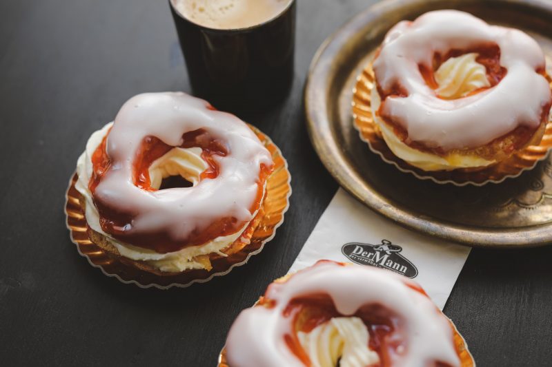 Ein luftig-leicht gebackener Ring aus Brandteig wird mit Puddingcreme und Schlagcreme gefüllt, auf der Oberseite mit Marillenmarmelade bestrichen und mit Fondant überzogen.