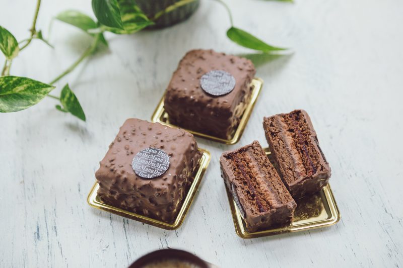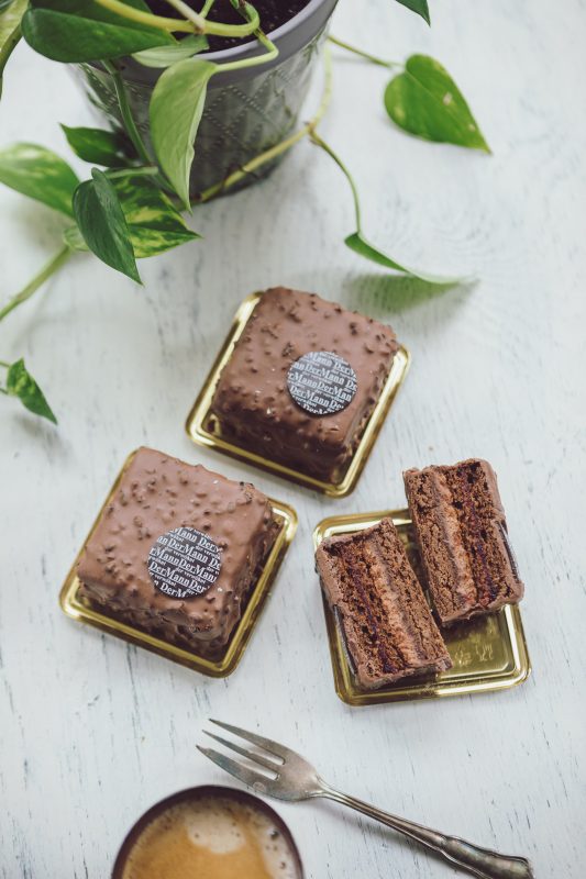 Feine Sacherböden gefüllt mit Knusperfüllung, darüber Nougatoberscreme und Ribisel-Preiselbeerfruchtfüllung. Überzogen mit Nougat, welches feine Kakaostückchen enthält. Ein Knusper-Erlebnis für Schokolade-Fans!