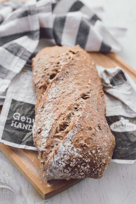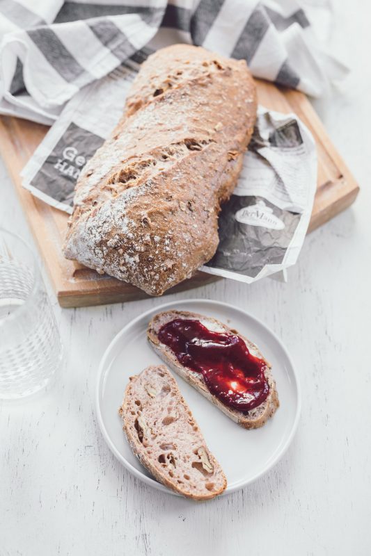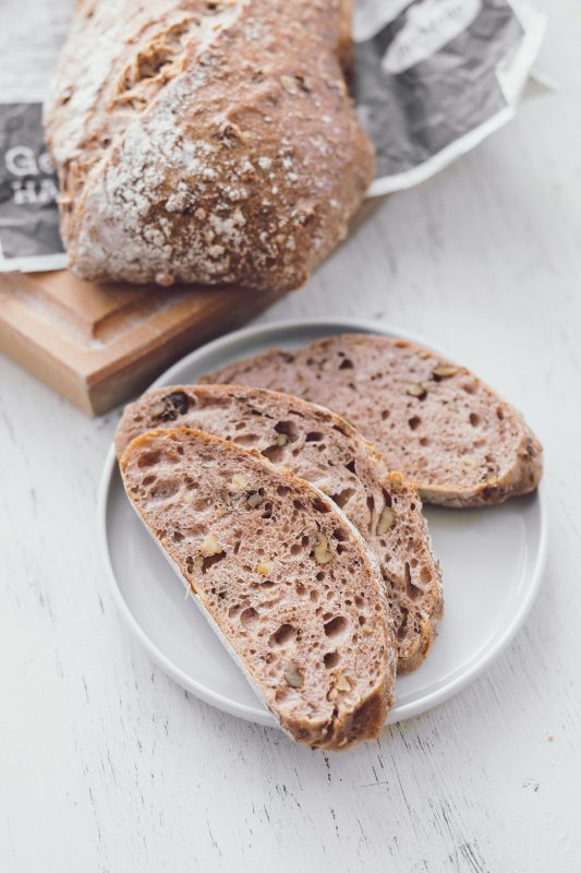 Das aus 100% Dinkel gebackene Brot hat einen sehr hohen Walnussanteil, der Teig wird über 24 Stunden geführt. Durch diese lange Teigführung mit den Walnüssen entsteht auch die spezielle Farbe des Brotes. Das Brot wird anschliessend doppelt gebacken. Dadurch schmeckt das Brot sehr saftig und hält lange frisch.