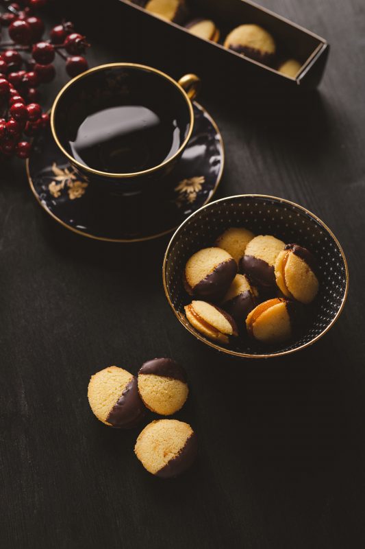 Mürbe Weihnachtskekse mit hohem Dottergehalt und Marillenmarmelade und mit Schokolade filiert.