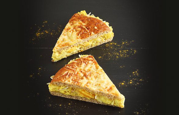 Flade: 48% WEIZENMEHL, Wasser, Backmischung [Leinsamen, SESAM, WEIZENGRAHAMSCHROT, ROGGENMEHL, SOJAMEHL, WEIZENKEIMMALZQUELLMEHL, ROGGENQUELLMEHL geröstet, HAFERWEIZENMALZQUELLMEHL, Roggensauerteig getrocknet (ROGGENMEHL), Gewürze, Spinatpulver, Zucker, Maisquellmehl, Säuerungsmittel (Citronensäure, Milchsäure), Dextrose, WEIZENKLEBER, Emulgator Mono- und Diglyceride von Speisefettsäuren], 7% Käse (MILCH, Maisstärke, Farbstoff beta- Carotin), Hefe, Margarine [pflanzliche Fette und Öle teilweise gehärtet (Raps, Sonnenblume), Aroma], Speisesalz jodiert (Siedesalz, Kaliumjodid). Belag: 26% Aufstrich [EIER gekocht, Rapsöl, Wasser, Zwiebel, Zucker, Weingeistessig, modifizierte Stärke, Speisesalz, HÜHNEREIEIGELBPULVER, Glukosesirup, Currygewürz, Gewürze- und Extrakte, Dextrose, SENFKORN gemahlen, Konservierungsstoff Kaliumsorbat, Farbstoff Carotin, Säuerungsmittel (Milchsäure, Citronensäure), Säureregulatoren (Natriumacetat, Natriumcarbonat, Essigsäure), Verdickungsmittel (Xanthan, Guarkernmehl, Johannisbrotkernmehl), Süßungsmittel Saccharin], 9% Hühnerbrust gegart, Ananas, Mungobohnensprossen, Mangozubereitung.