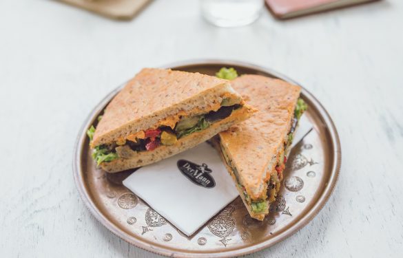 Luftige Brotflade, gefüllt mit Hummus-Aufstrich, Lollo-Salat, sowie einer Gemüsemischung bestehend aus Gemüsepaprika, Zucchini und Aubergine, die in Olivenöl und einer Kräutermischung angebraten wurde
