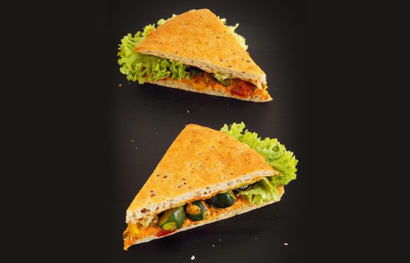 Luftige Brotflade, gefüllt mit Hummus-Aufstrich, Lollo-Salat, sowie einer Gemüsemischung bestehend aus Gemüsepaprika, Zucchini und Aubergine, die in Olivenöl und einer Kräutermischung angebraten wurde