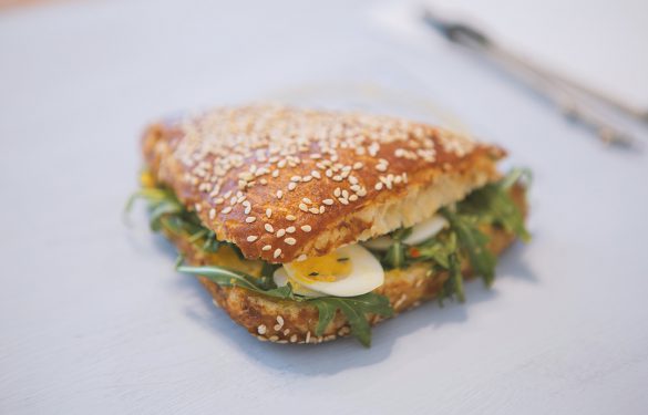 Für diesen Imbiss, der vor allem für das zweite Frühstück ideal ist, backen wir ein mit Sesam bestreutes Butterplundergebäck in Dreiecksform, das wir mit Eiaufstrich und Eischeiben füllen, mit Rucola belegen und mit Schnittlauch garnieren. Ein Geschmackserlebnis!