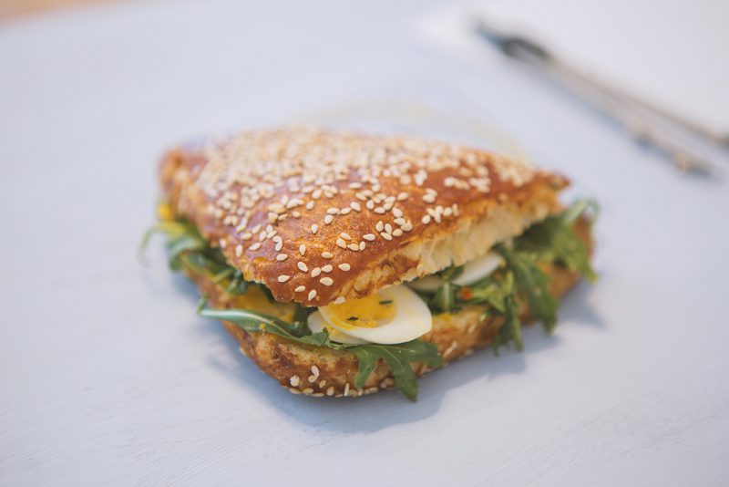 Für diesen Imbiss, der vor allem für das zweite Frühstück ideal ist, backen wir ein mit Sesam bestreutes Butterplundergebäck in Dreiecksform, das wir mit Eiaufstrich und Eischeiben füllen, mit Rucola belegen und mit Schnittlauch garnieren. Ein Geschmackserlebnis!