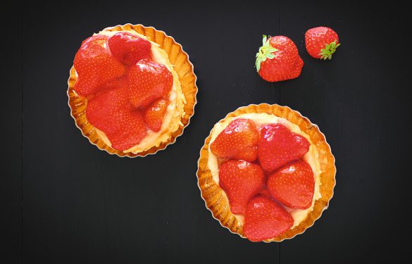 Luftiger Biskuitboden mit frischen Erdbeeren und einer fruchtigen Erdbeercreme versehen.