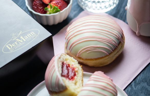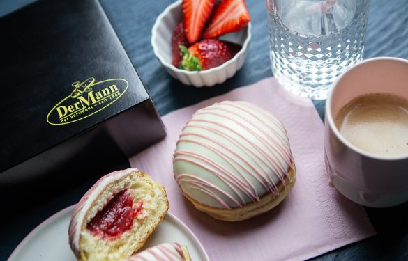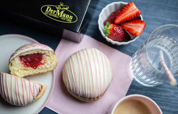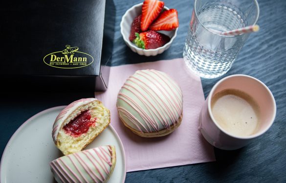 Flaumiger Krapfen gefüllt mit frisch gekochter Erdbeerfüllung, glasiert mit weisser Schokomasse und verziert.