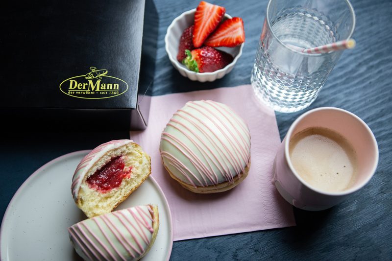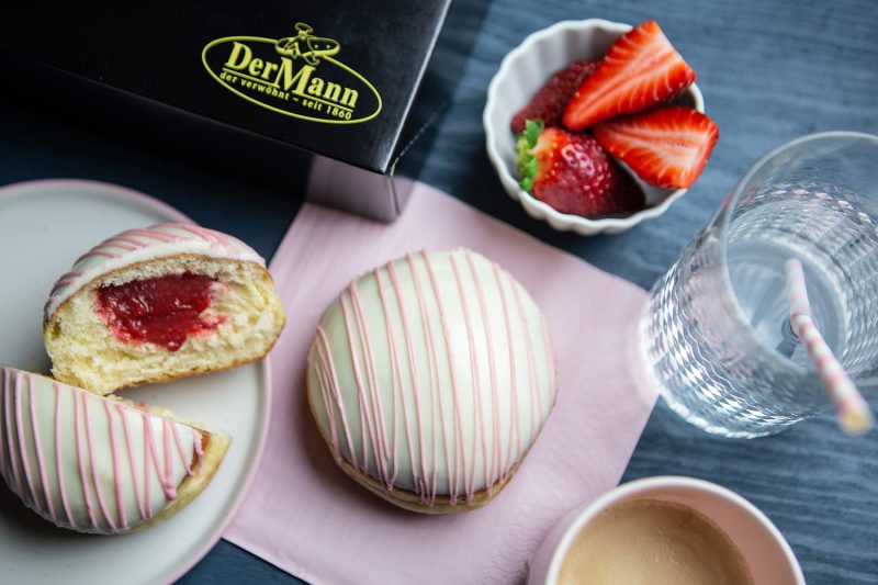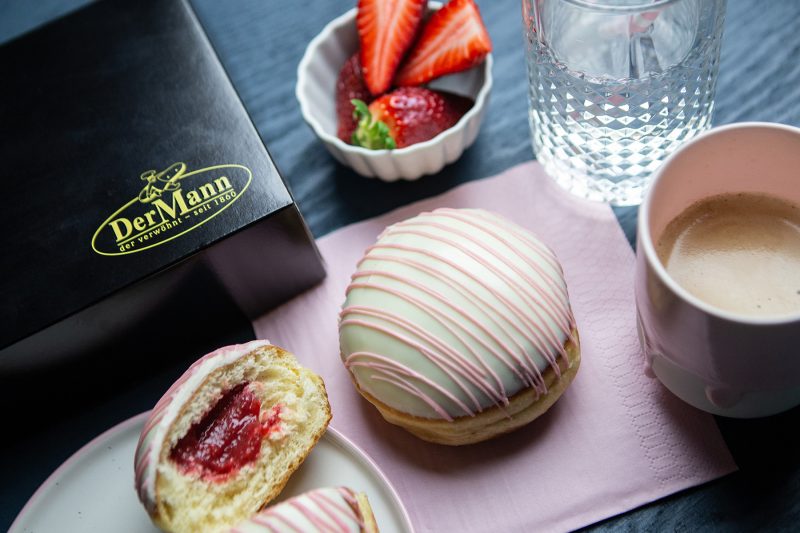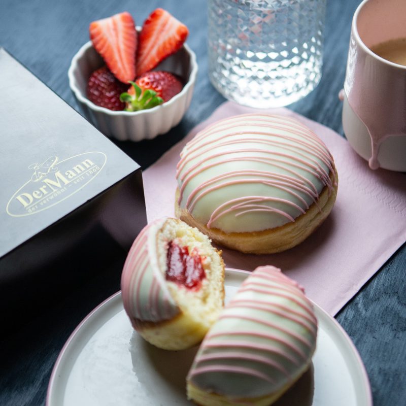 Flaumiger Krapfen gefüllt mit frisch gekochter Erdbeerfüllung, glasiert mit weisser Schokomasse und verziert.
