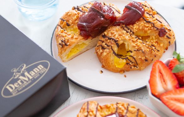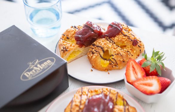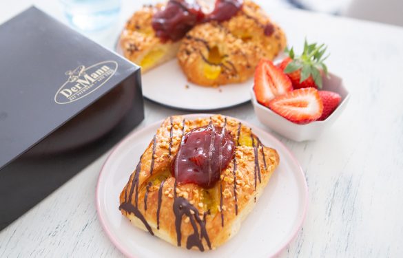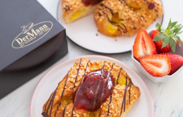 Ein saftiger Butterplunder wird mit Pudding gefüllt, zur Golatsche geformt und nach dem schonenden Backen mit einer Erdbeerfruchtfülle veredelt.