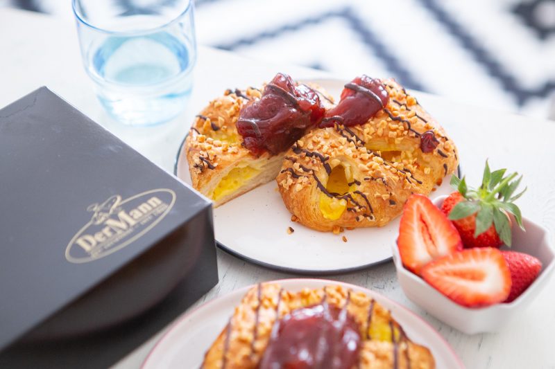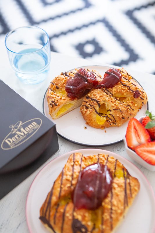 Ein saftiger Butterplunder wird mit Pudding gefüllt, zur Golatsche geformt und nach dem schonenden Backen mit einer Erdbeerfruchtfülle veredelt.