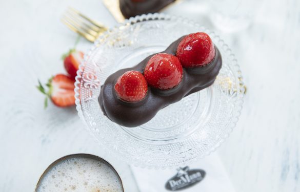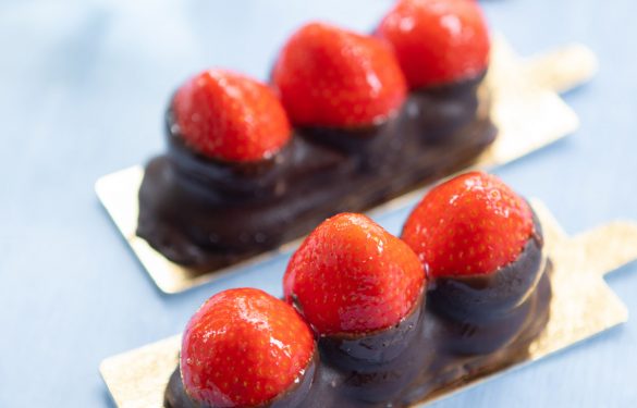 Frische Erdbeeren auf einem herrlichen Makronengebäck, teilweise überzogen mit Schokolade.