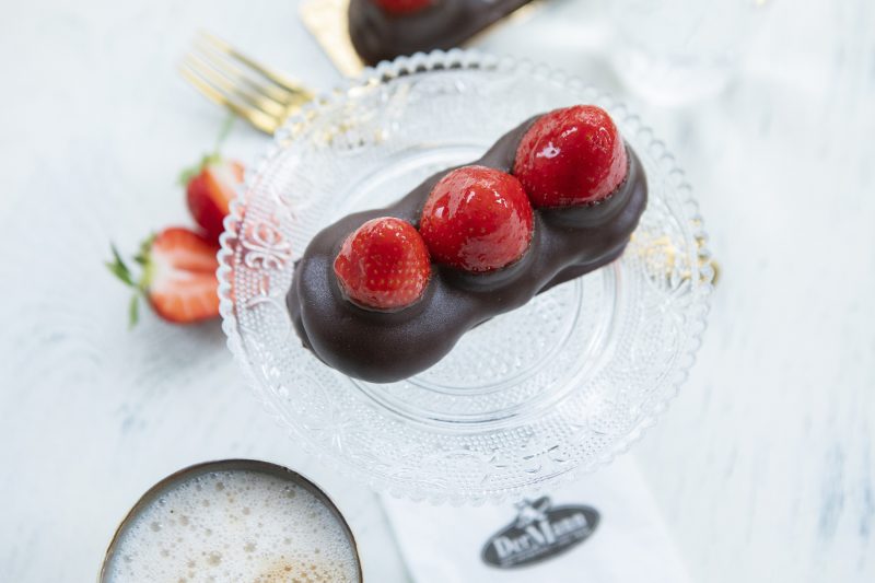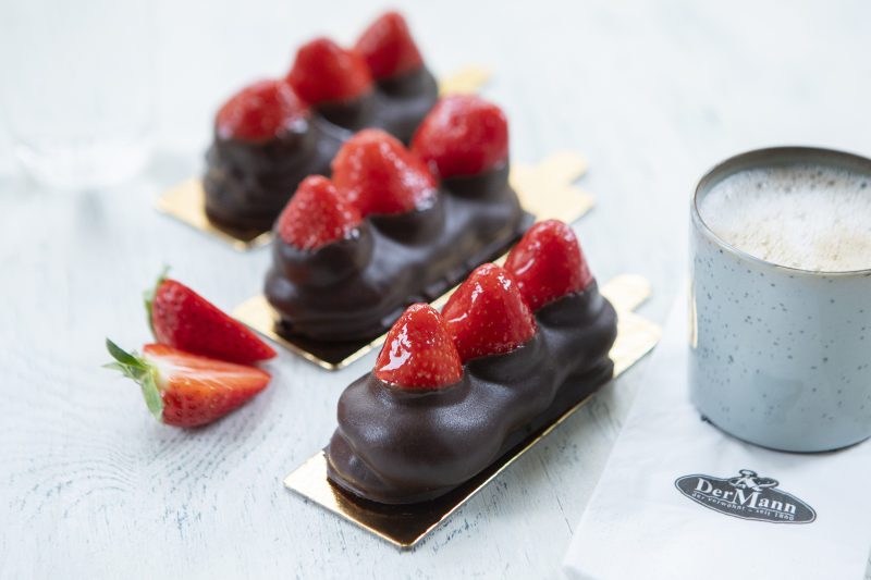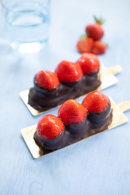 Frische Erdbeeren auf einem herrlichen Makronengebäck, teilweise überzogen mit Schokolade.