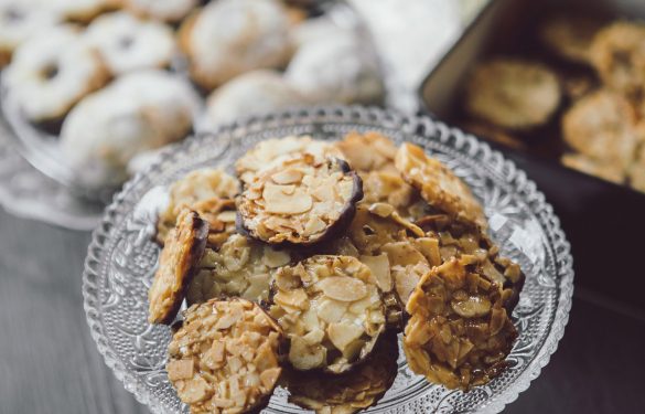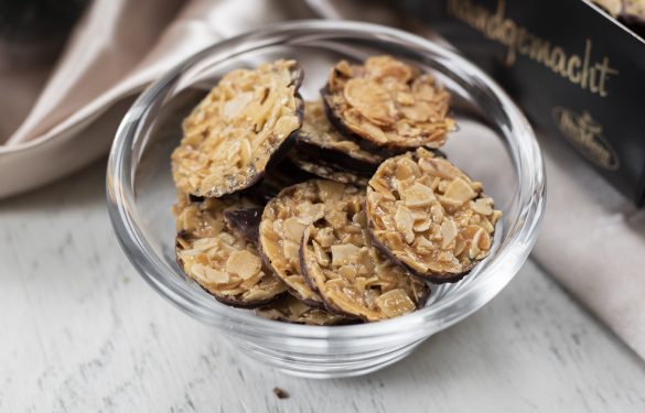 Einzigartig rundes Teegebäck mit Mandeln in einer edlen schwarzen Dose.