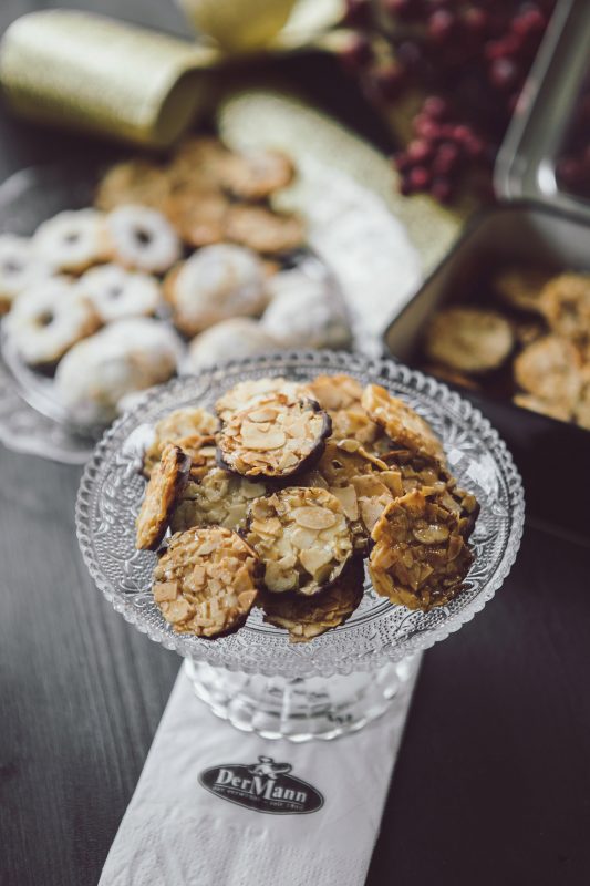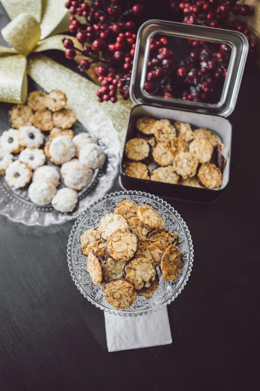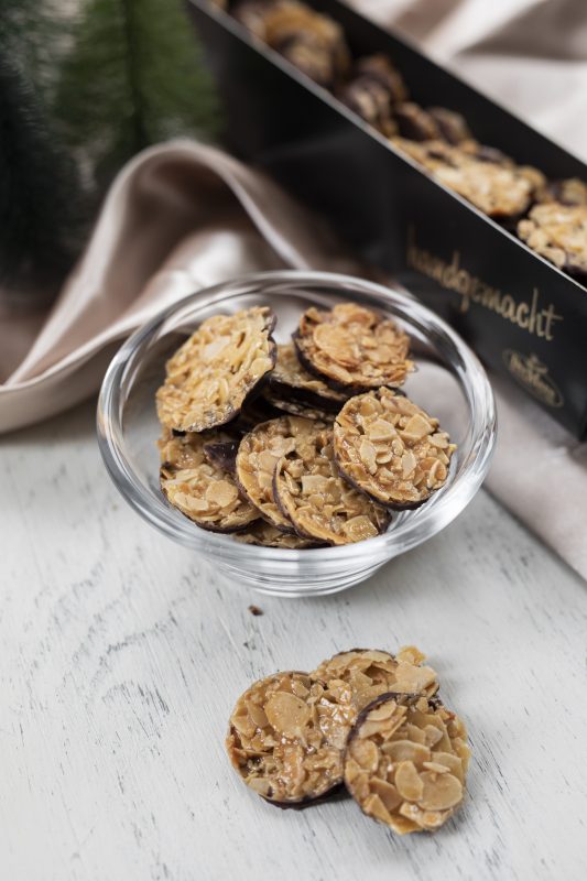 Einzigartig rundes Teegebäck mit Mandeln in einer edlen schwarzen Dose.
