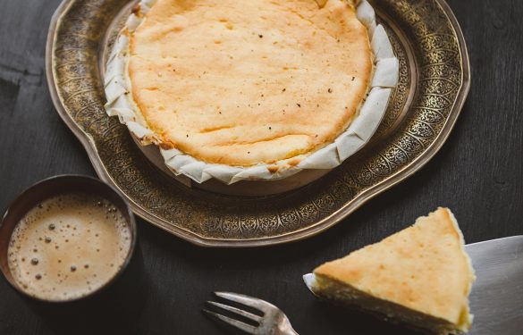 Luftige Topfen-Soufflé-Masse auf knackigem Streuselboden in runder Holzform.