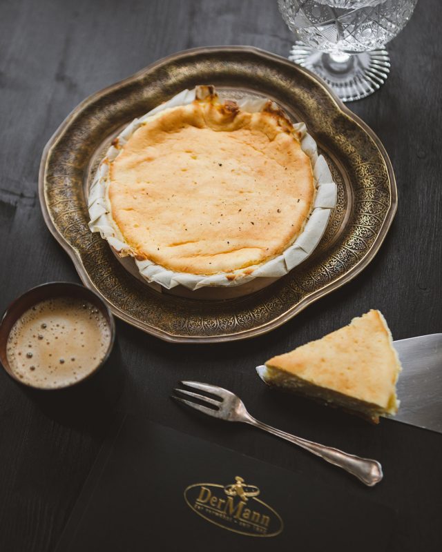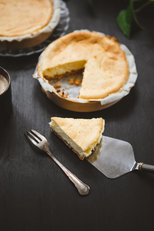 Luftige Topfen-Soufflé-Masse auf knackigem Streuselboden in runder Holzform.