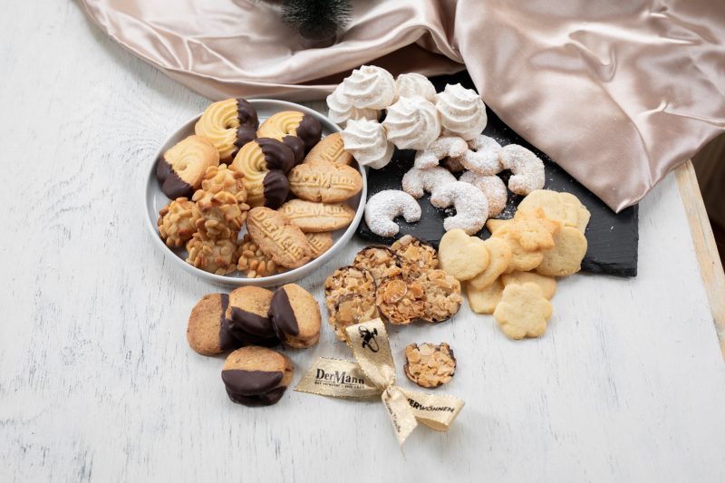 Gemischte Box mit einer Auswahl an Keks-Köstlichkeiten: Vanillekipferl, Wiener Kipferl, Schokokipferl, Dotterbusserl, Polo Nero, Linzeraugen, Nusskekse, Eisenbahner, Schoko-Nuss, Rum-Nuss, Himbeerschüsserl, Pignolie, Tannenbaum, Florentiner, Schneeringerl.