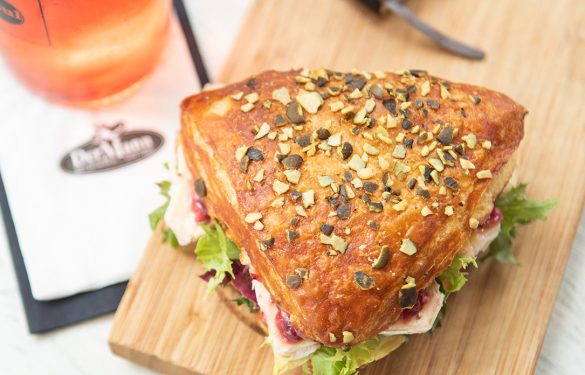 Laugenpolster in Dreickform bestreut mit Kürbiskernen, gefüllt mit Frischkäse und knackigem Salatmix. Belegt mit würzigem Weichkäse in Kombination mit süssen Wildpreiselbeeren.