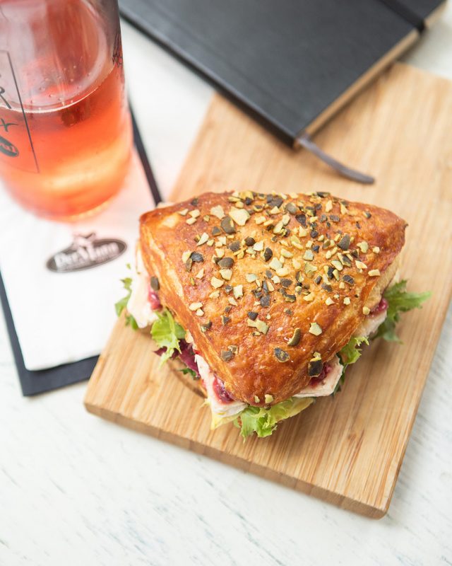 Laugenpolster in Dreickform bestreut mit Kürbiskernen, gefüllt mit Frischkäse und knackigem Salatmix. Belegt mit würzigem Weichkäse in Kombination mit süssen Wildpreiselbeeren.