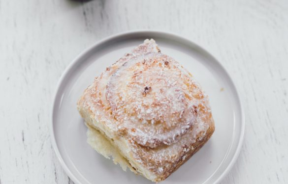 Unser beliebter Butterplunderteig zu einer süssen Schnecke gerollt. Nach dem Backen wird die Schnecke mit einer Staubzucker-Frischrahm-Kokos-Glasur bestrichen.