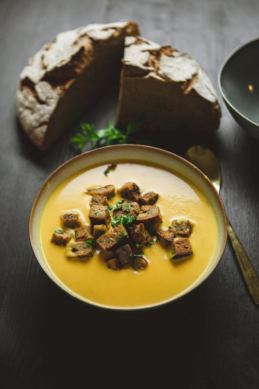 Kürbissuppe mit Krustenlandler-Kräuter-Croutons
