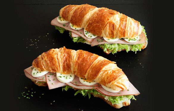 Mit herzhaftem Kräuteraufstrich bestrichen, mit frischem Salat, dünn aufgeschnittenem Beinschinken und Ei-Scheiben belegt, wird das zarte Laugencroissant zu einer speziellen Gaumenfreude.