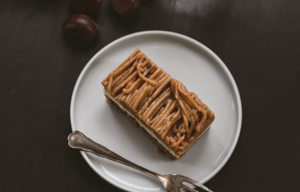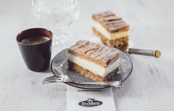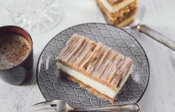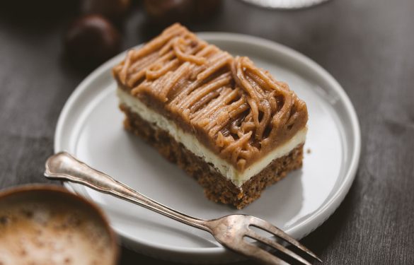 Ein saftiger Nussboden auf einem Linzerteig mit feiner Vanilleoberscreme und reichlich Maronipüree bestimmen diese Schnitte.