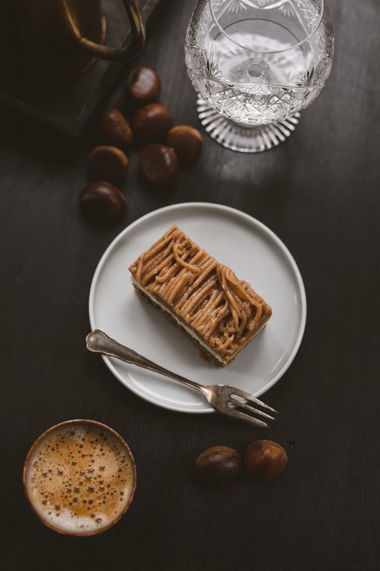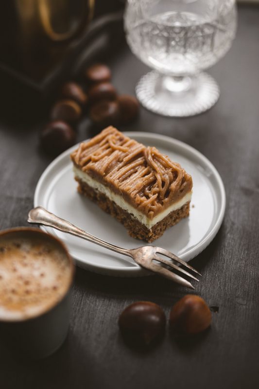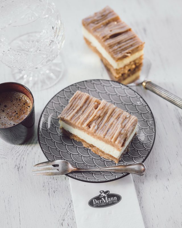 Ein saftiger Nussboden auf einem Linzerteig mit feiner Vanilleoberscreme und reichlich Maronipüree bestimmen diese Schnitte.