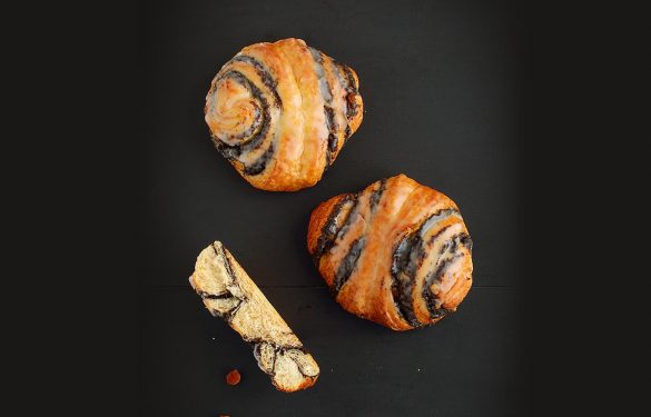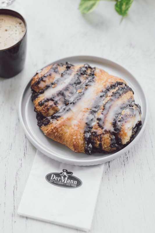 Feinsten Butterplunderteig formen wir mit aromatischer Mohnfülle mit Rosinen zu einer Schnecke. Nach dem schonenden Backvorgang wird die Schnecke mit heisser Konfitüre bestrichen und mit gekochtem Zucker glasiert. Dadurch bleibt die Schnecke länger saftig.