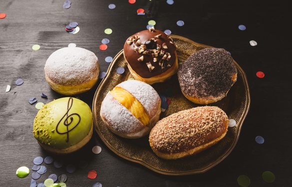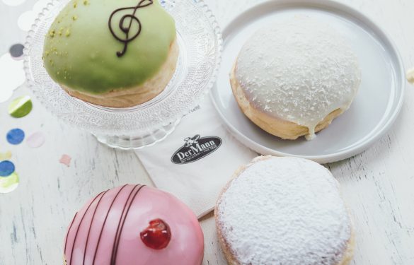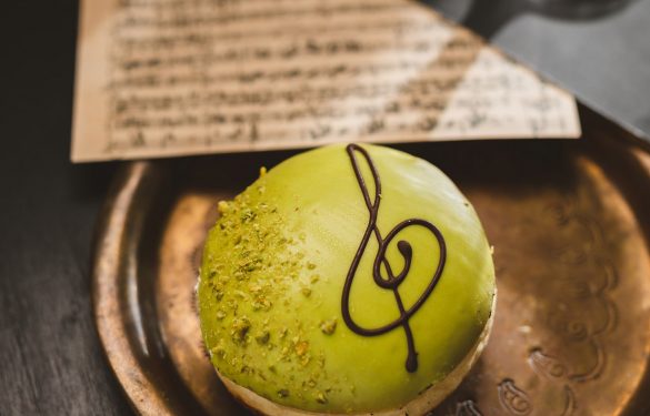 Für alle, die Abwechslung lieben. Der flaumige Krapfen ist mit einer Nougat-Pistazienfüllung gefüllt, überzogen mit Pistazienfondant und mit Pistazien und Schokolade dekoriert.