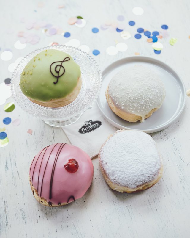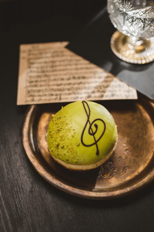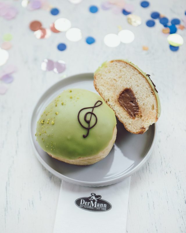 Für alle, die Abwechslung lieben. Der flaumige Krapfen ist mit einer Nougat-Pistazienfüllung gefüllt, überzogen mit Pistazienfondant und mit Pistazien und Schokolade dekoriert.
