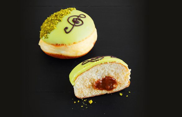 Kunstvoll wie sein Namensgeber kommt unser Mozart-Krapfen daher. Die auffällige Pistazienglasur mit einem feinen Notenschlüssel aus Schokolade erobert das Geniesser-Herz im Sturm. Diese exquisite Kreation begeistert zudem mit einer Füllung aus Nougat und Pistazien, die jedem Bissen einen Hauch von Eleganz verleiht.