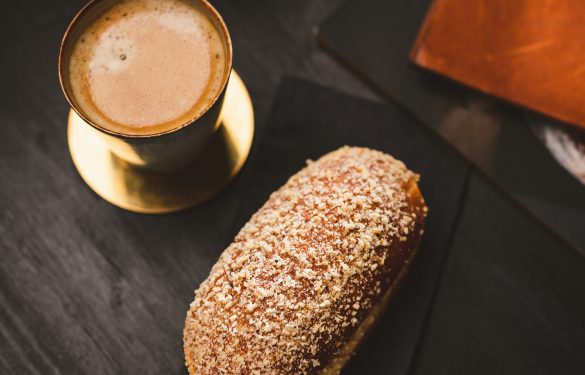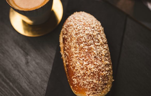 Saftiger Krapfen mit Nougatfüllung und Nüssen bestreut.