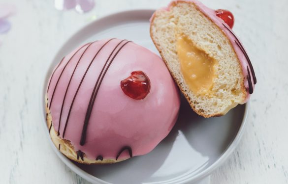 Für alle, die Abwechslung lieben. Der flaumige Krapfen ist mit Punschpudding gefüllt, überzogen mit Punschglasur und mit einer Kirsche und Schokolade dekoriert.