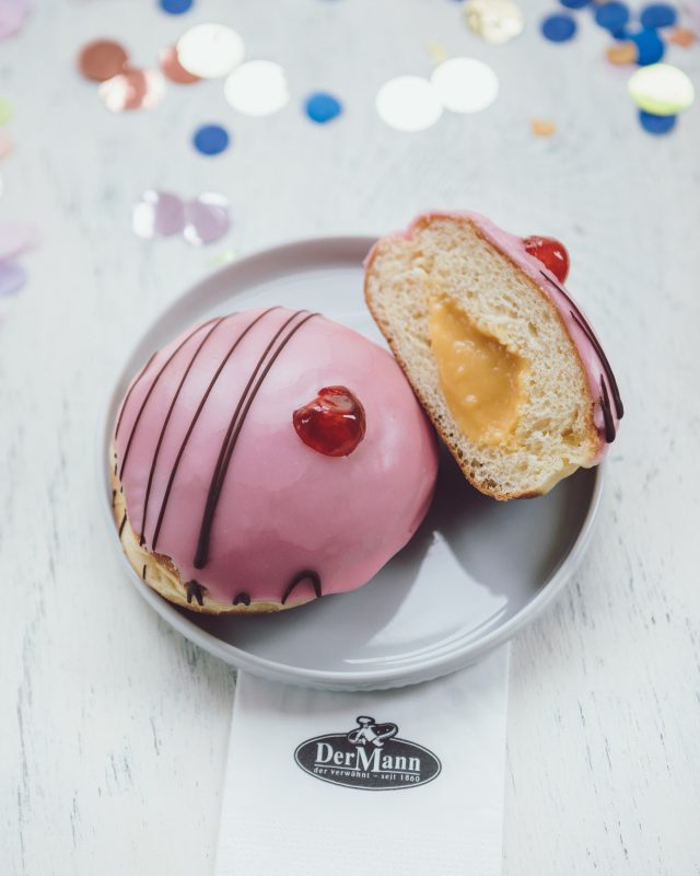 Für alle, die Abwechslung lieben. Der flaumige Krapfen ist mit Punschpudding gefüllt, überzogen mit Punschglasur und mit einer Kirsche und Schokolade dekoriert.
