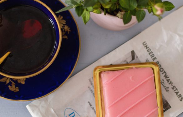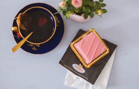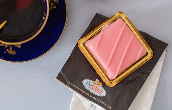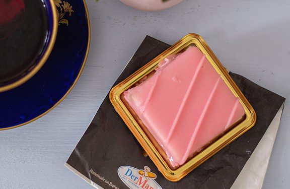 Unser Punschdessert in der elegant rechteckigen Form besteht aus feinem Biskuit, gefüllt mit Marillenmarmelade & Schoko-Nuss-Masse und ist mit rosa Fondant glasiert.