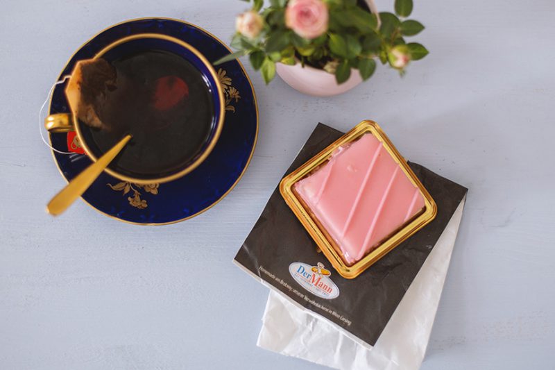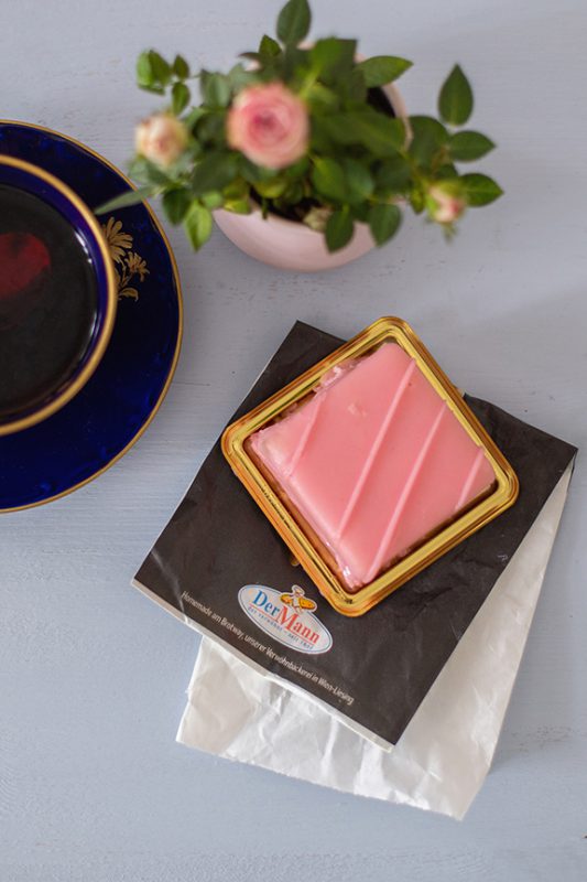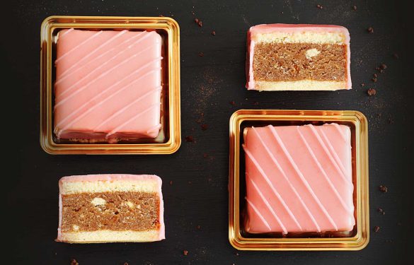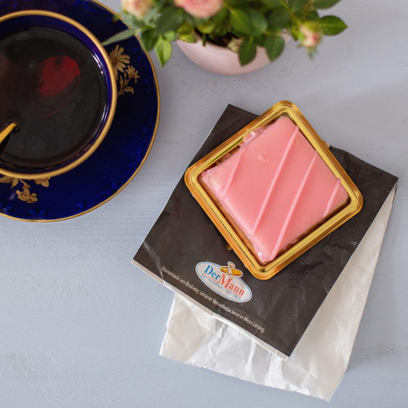 Unser Punschdessert in der elegant rechteckigen Form besteht aus feinem Biskuit, gefüllt mit Marillenmarmelade & Schoko-Nuss-Masse und ist mit rosa Fondant glasiert.