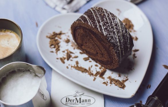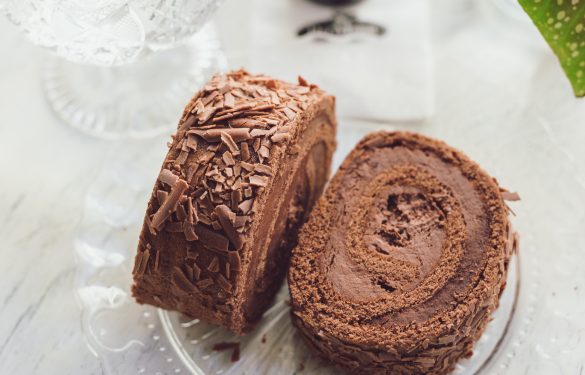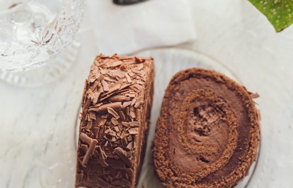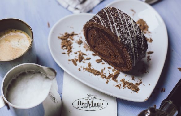 Dunkler Kakaobiskuitboden mit einer zarten Schicht Himbeermarmelade, gefüllt mit Schokoladenoberscreme, veredelt mit Milchschokoladeraspel.