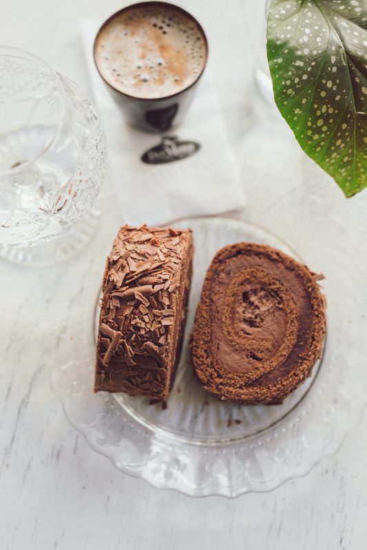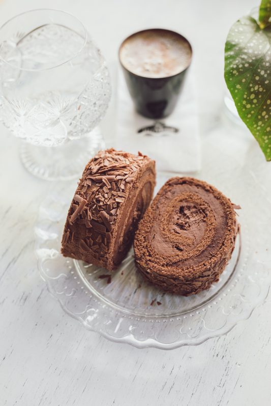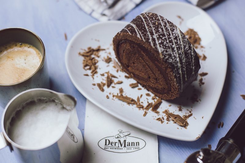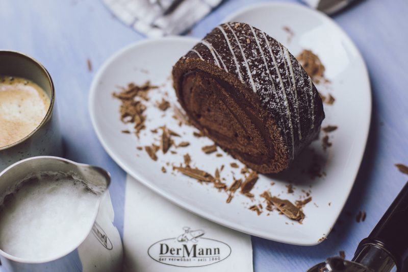 Dunkler Kakaobiskuitboden mit einer zarten Schicht Himbeermarmelade, gefüllt mit Schokoladenoberscreme, veredelt mit Milchschokoladeraspel.