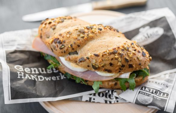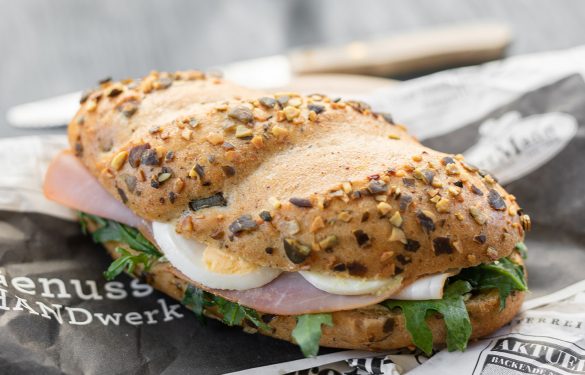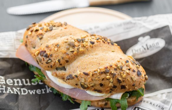 Kürbiskernweckerl mit Kürbiskernaufstrich, Rucola, Kürbiskernschinken und Eiern.